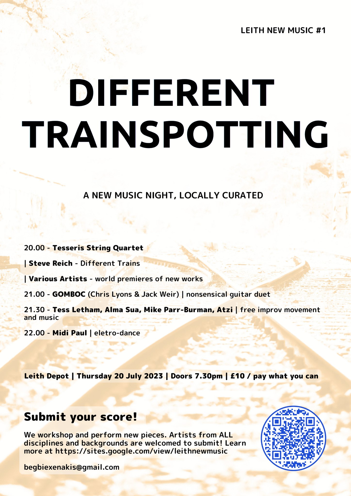 Tesseris perform Steve Reich's Different Trains alongside six new works for string quartet picked from a call for scores. Also featuring GOMBOC; Tess, Alma, Mike and Atzi; and Midi Paul.
